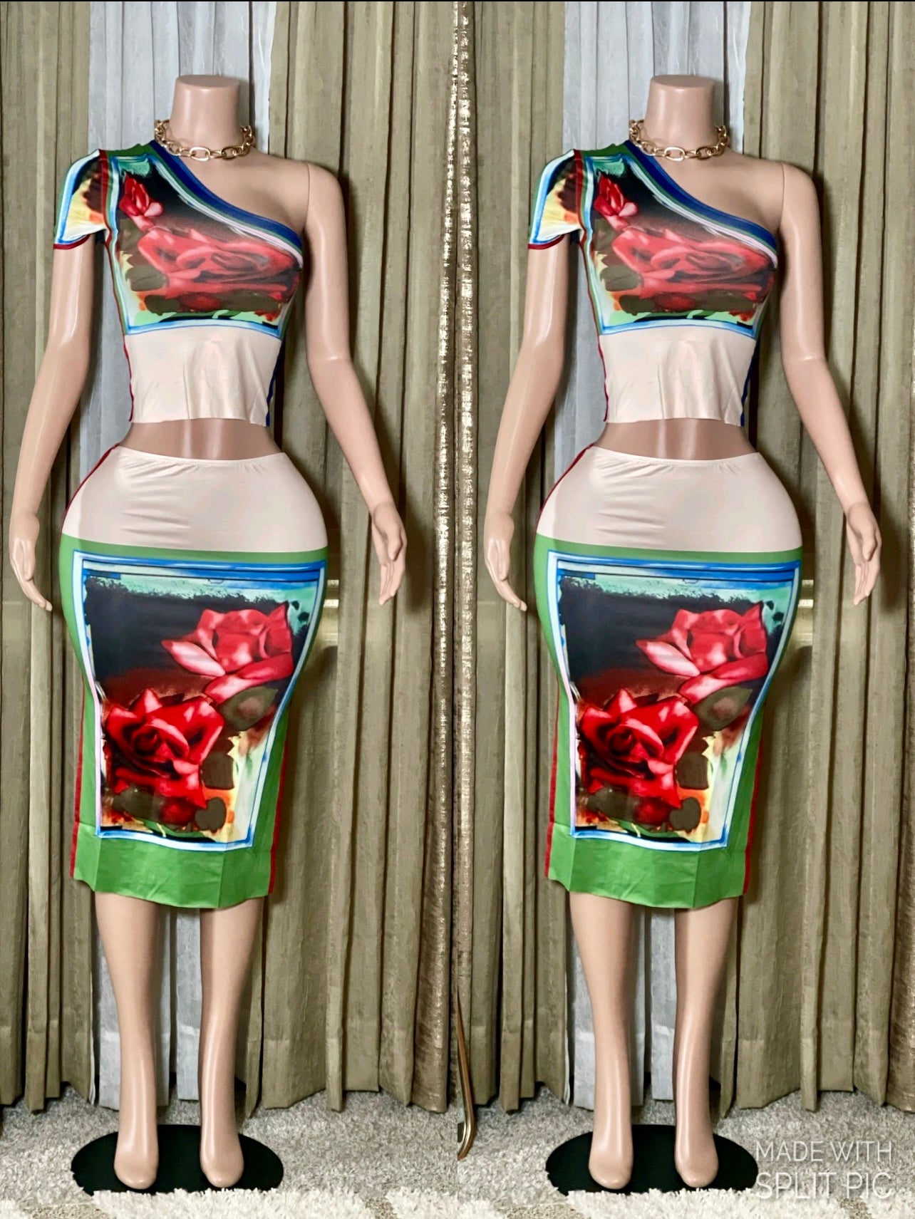 This set features a one shoulder, short sleeves top, high waistband midi, side slit skirt.